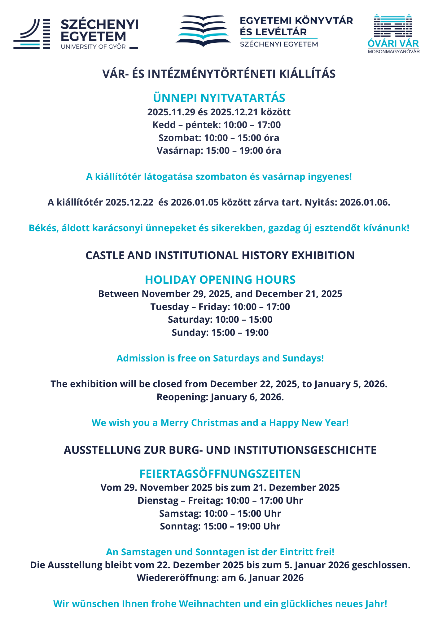 A megújult magyaróvári vár földszintjén kapott helyet a Vár- és Intézménytörténeti kiállítás, amely az épület és a több, mint 200 éves egyetemi kar történetét mutatja be háromnyelvű tablók, érintőképernyők és interaktív játékelemek segítségével.