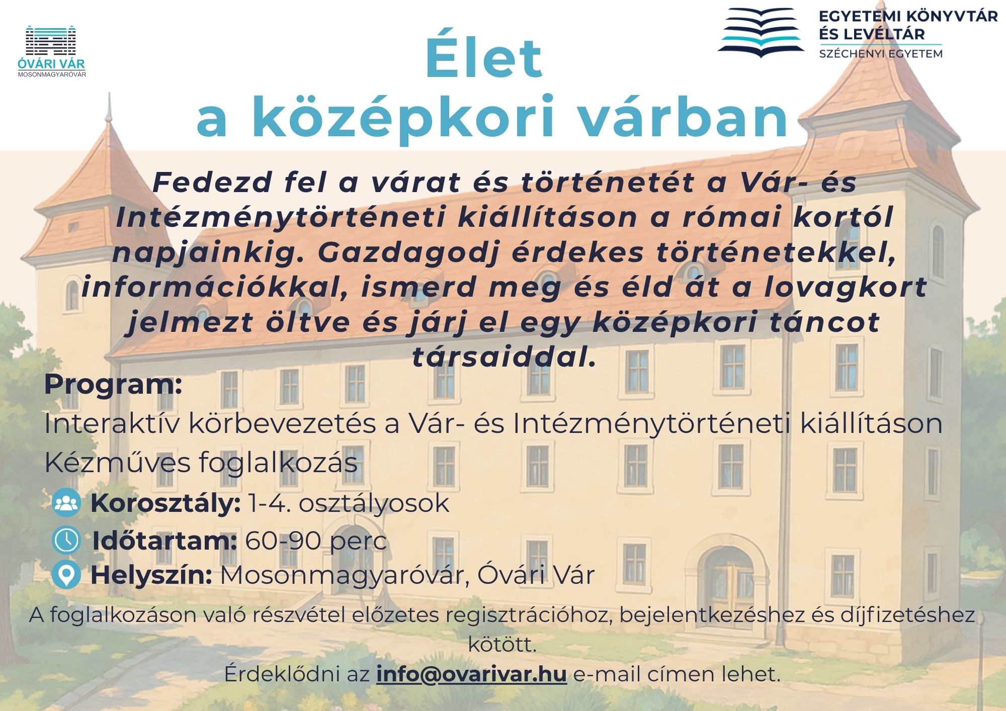 Indulj velünk időutazásra az ÓVÁRI VÁRBAN! Fedezd fel a várat és történetét a Vár- és Intézménytörténeti kiállításon a római kortól napjainkig. Gazdagodj érdekes történetekkel, információkkal, ismerd meg és éld át a lovagkort jelmezt öltve és járj el egy középkori táncot társaiddal. Keltsd életre a középkort választható kézműves foglalkozásaink egyikén: