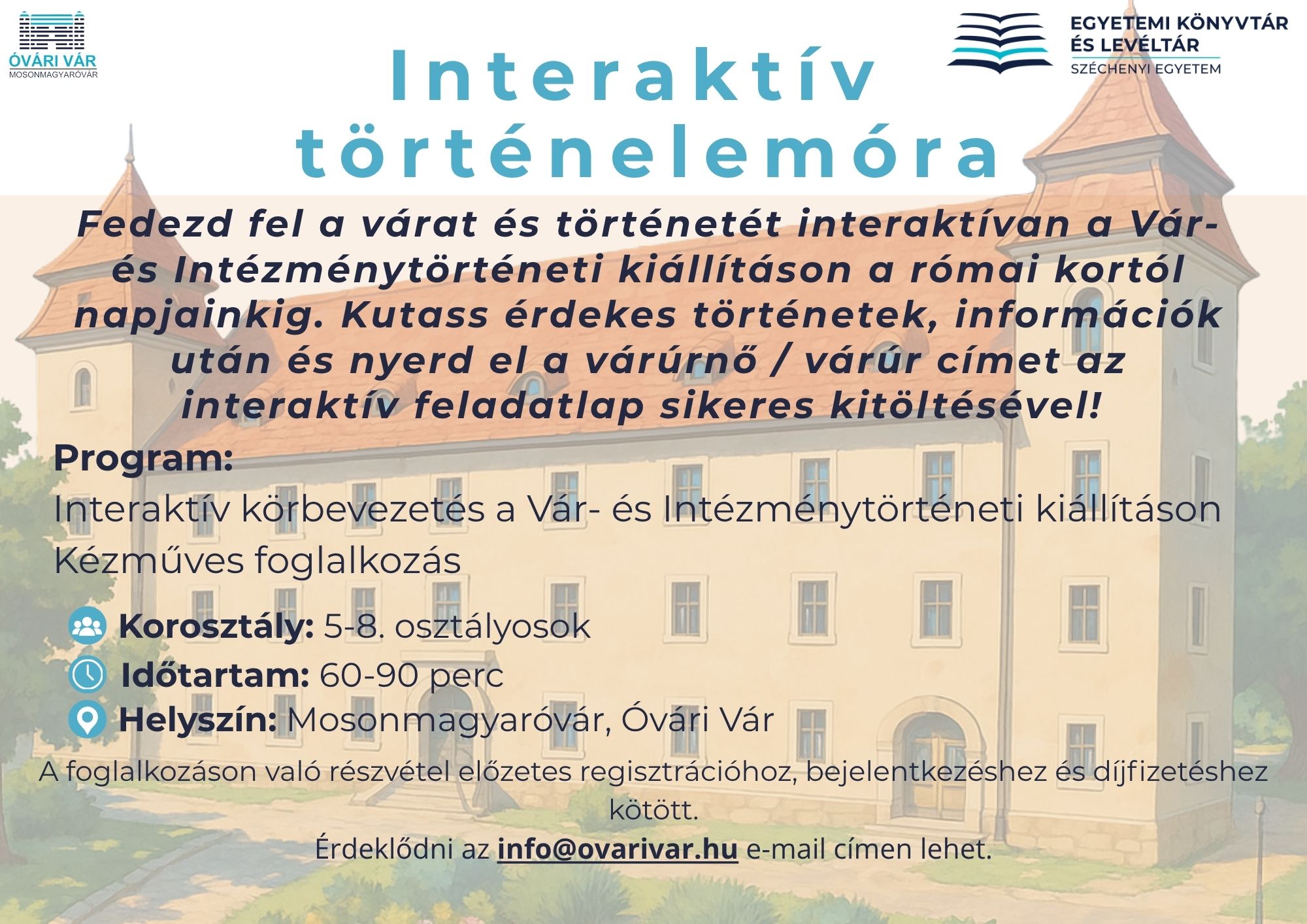 Indulj velünk időutazásra az ÓVÁRI VÁRBAN! Fedezd fel a várat és történetét interaktívan a Vár- és Intézménytörténeti kiállításon a római kortól napjainkig. Kutass érdekes történetek, információk után és nyerd el a várúrnő / várúr címet az interaktív feladatlap sikeres kitöltésével!